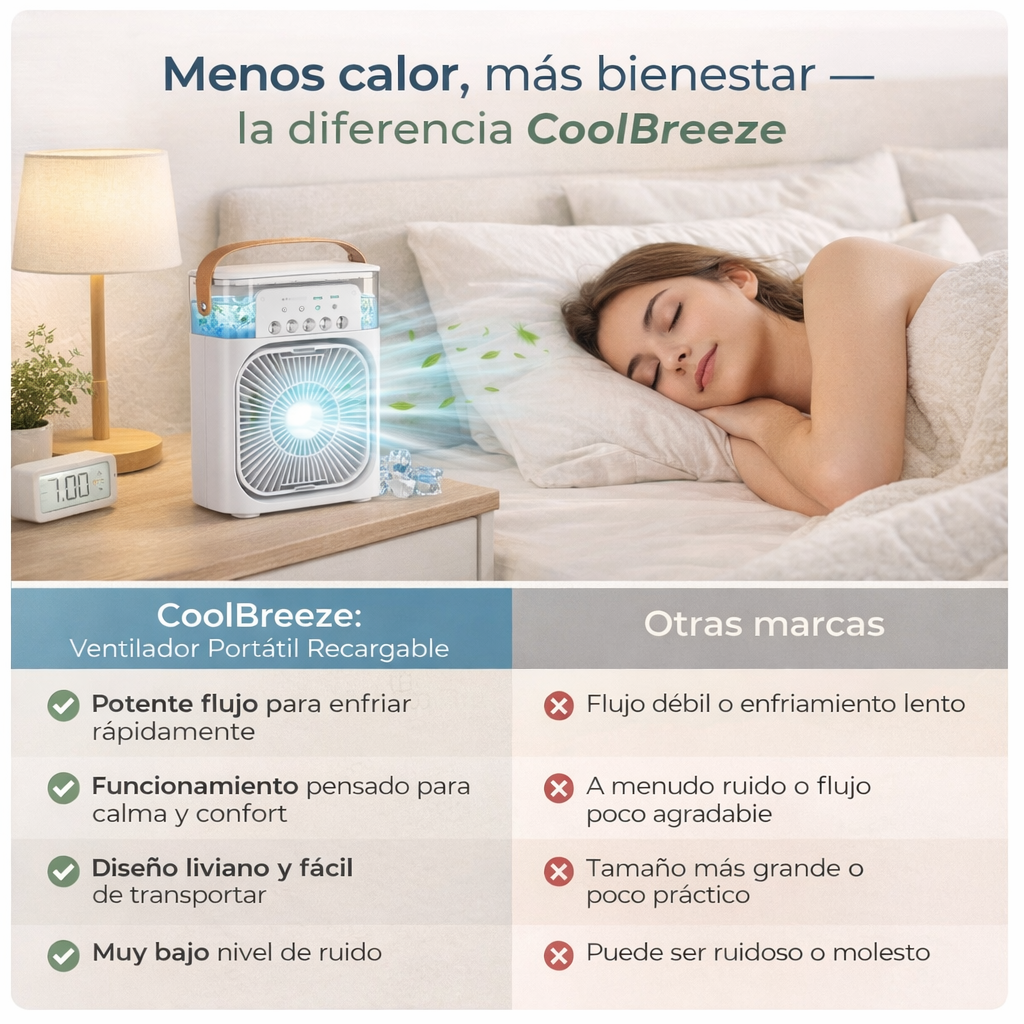 El calor encerrado no solo incomoda: te quita energía, concentración y descanso. CoolBreeze™ está diseñado para entregarte frescura real y alivio inmediato, sin instalaciones, sin complicaciones y sin ese aire seco que solo empeora la sensación.